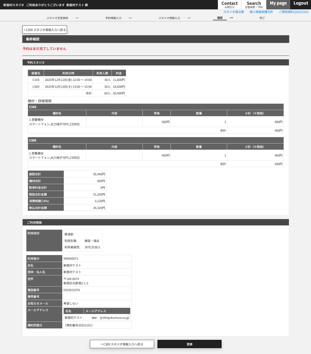 ご予約の最終確認画面が表示されますので、予約スタジオ・ご利用情報・合計料金を確認し、問題なければ「登録」をクリック(タップ)してください