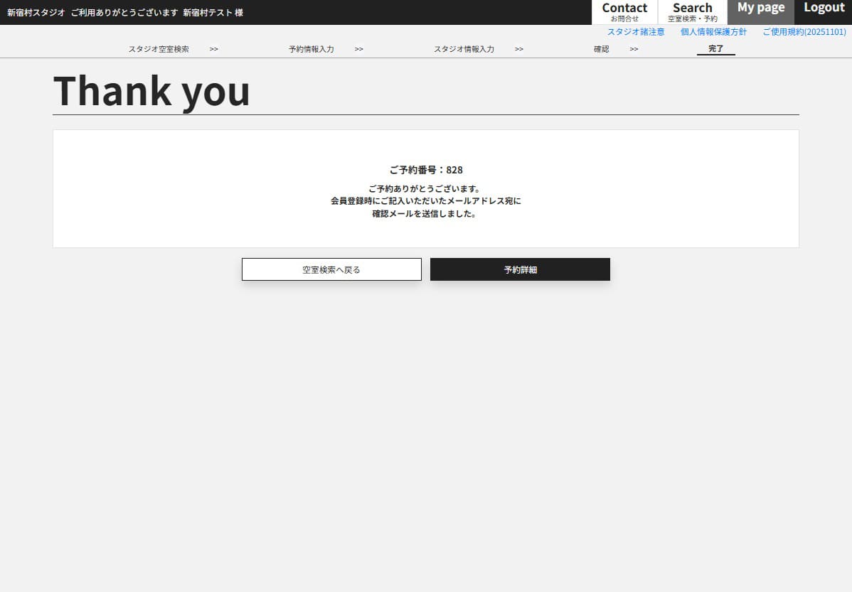 画面上部に「ご利用ありがとうございます」と表示された段階で予約確定となります。予約通知メールも合わせてご確認ください。