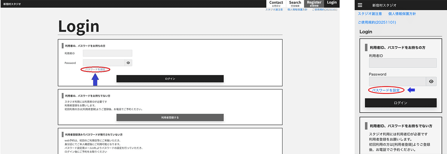 WEB予約はご本人確認後、ログイン画面からパスワード設定をしていただいてご利用可能となります。