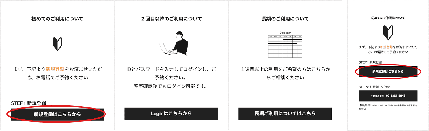 まず、下記より新規登録をお済ませいただき、お電話でご予約ください