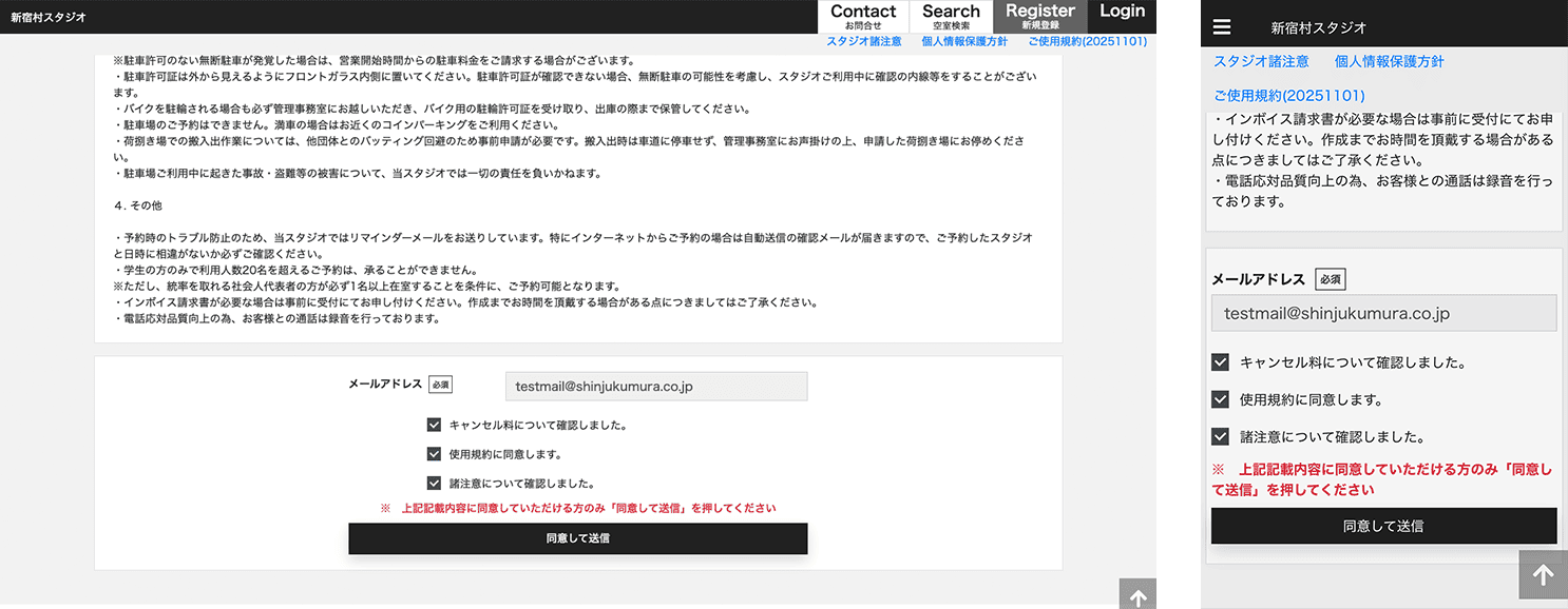 表示される【利用者登録のご注意】【個人情報保護方針】【使用規約】【スタジオ諸注意】をご確認ください。ご確認が済みましたら、チェックボックスにチェックを入れ、メールアドレスを入力してください。「同意して送信」をクリックし、ポップアップの「OK」をクリックしてください。